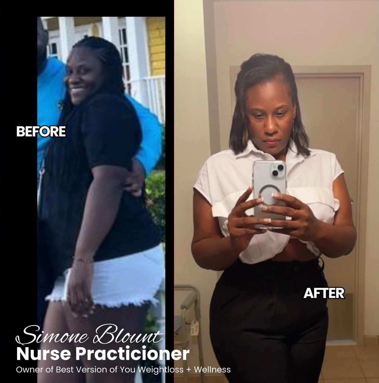 Hi, I am Simone Blount, Nurse Practitioner & Owner of Best Version of You Weight Loss + Wellness. My mission is to provide a program that allows you to become the best version of you!!! I believe on the program and products that I prescribe and that is why I use them myself. I have lost over 40 lbs. and feel great! I am now the best version of myself and that includes a healthier me where I have managed my weight, resulting on the control of my diabetes and blood pressure.